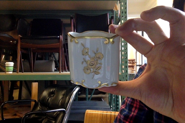 Oblong Cylinder Shape w/Gold Leaf Scalloped Rim & Floral Design