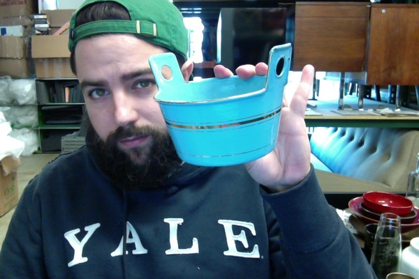 Metal Blue and Gold Dish with 2 handles with holes on the side