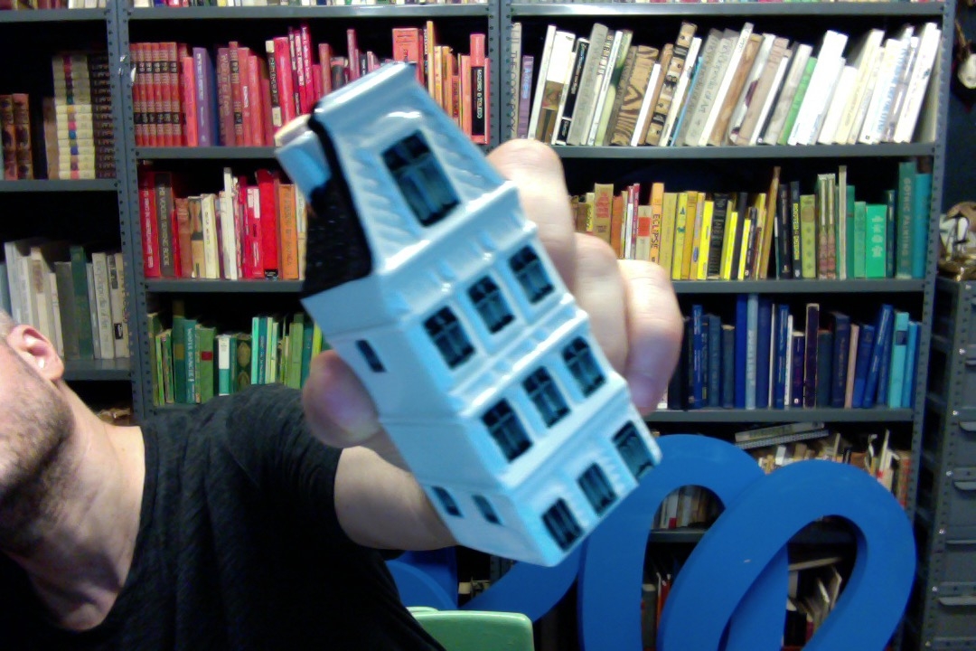 white and blue porcelain house figurine with chimney